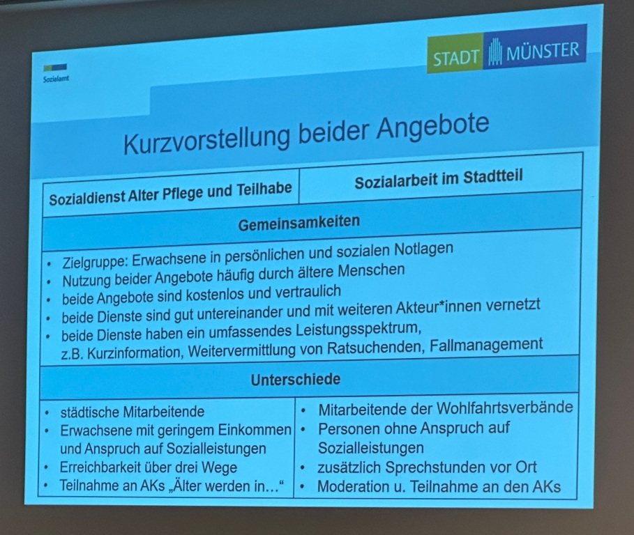 Anhand einer Power-Point-Präsentation sowie Handouts erläuterte Melina Schlinge vom Sozialamt die Beratungs- bzw. Hilfsangebote „Sozialarbeit im Stadtteil“ sowie „Sozialdienst Alter, Pflege und Teilhabe“. Beide Angebote richten sich an hilfebedürftige Erwachsene (wobei empirisch gesehen vor allem Ältere diese in Anspruch nehmen). Während der „Sozialdienst“ von Mitarbeitenden des Sozialamtes durchgeführt wird und Menschen mit geringem Einkommen adressiert (Empfänger von Sozialhilfe oder Grundsicherung im Alter), verantworten die Wohlfahrtsverbände (Diakonie, Caritas, Deutsches Rotes Kreuz, Arbeiterwohlfahrt) die „Sozialarbeit im Stadtteil“. Inhaltlich geht es um Beratung in persönlichen oder finanziell schwierigen Situationen; Vermittlung von Informationen und Hilfe zu Unterstützungsmöglichkeiten im Alter; Kontaktanbahnung zu Fachdiensten; Unterstützung bei Wegen aus der Einsamkeit sowie Austausch mit Gleichbetroffenen. Anhand einer interaktiven Karte machte Melina Schlinge deutlich, in welchen Stadtteilen welche Ansprechpartner inklusive Kontaktdaten verortet seien. Mit Blick auf die nicht durchgängig gegebene digitale Kompetenz insbesondere Älterer wiesen einige Mitglieder der Seniorenvertretung auf aus ihrer Sicht bestehende Zugangsprobleme für Betroffene hin.